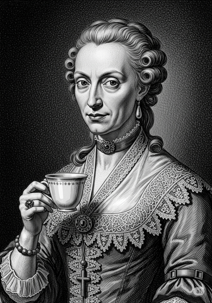 Das mutmaßliche Ur-Liesgen von 1715. Man beachte die Andeutung ihres Stifts-Kreuzes als unverheiratete, gleichwohl heiratswütige Canonissin eines nordmitteldeutschen evangelischen Closters. Das Koppchen (aus Meissen?) ist natürlich viel zu groß imaginiert. (Symbolbild, erstellt mit Nano Banana).