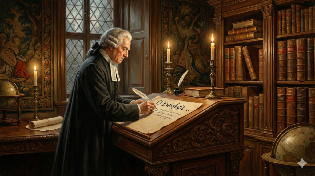 Das mutmaßliche Ur-Liesgen von 1715. Man beachte die Andeutung ihres Stifts-Kreuzes als unverheiratete, gleichwohl heiratswütige Canonissin eines nordmitteldeutschen evangelischen Closters. Das Koppchen (aus Meissen?) ist natürlich viel zu groß imaginiert. (Symbolbild, erstellt mit Nano Banana).